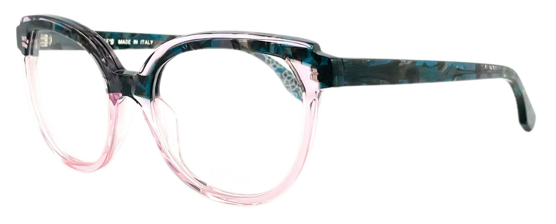 Pun dioptrijski okvir. Ženski model koji je u transparentno roze boji sa dodatkom teget-sivkaste boje koja se nastavlja na drške ovog okvira. Interesantnog dizajna koji će pružiti drugačiji izgled Vašem licu.