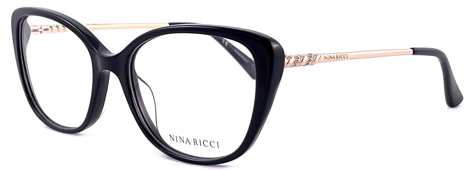 Okvir za naočare mačkastog oblika, crnog fronta sa zlatnim drškama i sitnim cirkonima, koji ovaj okvir čine elegnatnim.